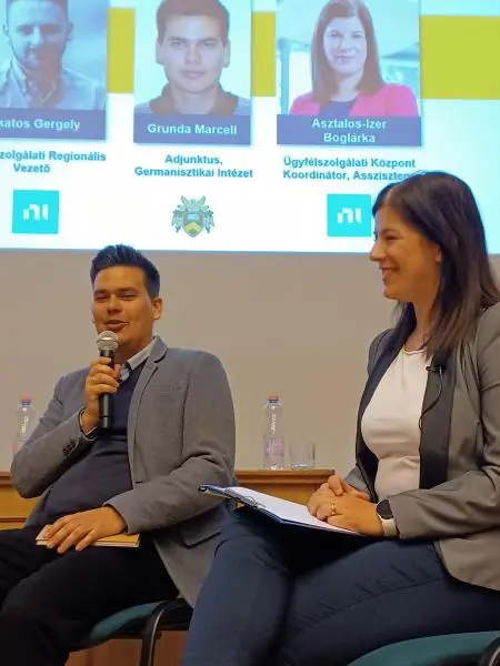 A beszélgetésen részt vett Megyesi Szilveszter, üzletági igazgató (4IG), Podlovics Tibor a DevOps és felhő szolgáltatások terület vezetője (EPAM), Lakatos Gergely, ügyfélszolgálati regionális vezető (NI) és Dr. Grunda Marcell, a Germanisztikai Intézet adjunktusa, megbízott intézetigazgató helyettese. A beszélgetést Asztalos-Izer Boglárka, az ügyfélszolgálati központ koordinátora, asszisztense (NI) moderálta.