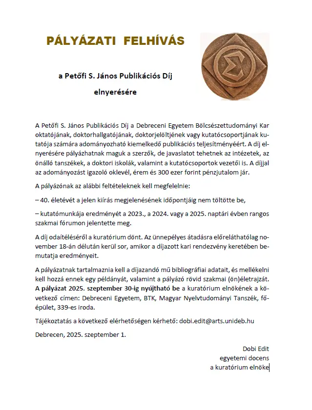 A Petőfi S. János Publikációs Díj a Debreceni Egyetem Bölcsészettudományi Kar oktatójának, doktorhallgatójának, doktorjelöltjének vagy kutatócsoportjának kutatója számára adományozható kiemelkedő publikációs teljesítményéért.
